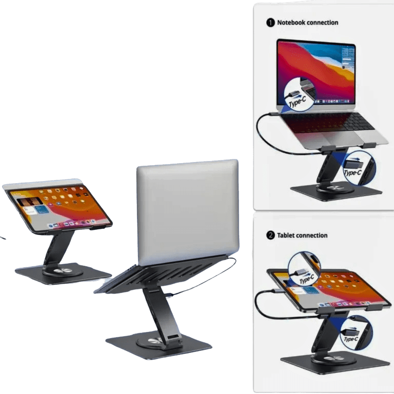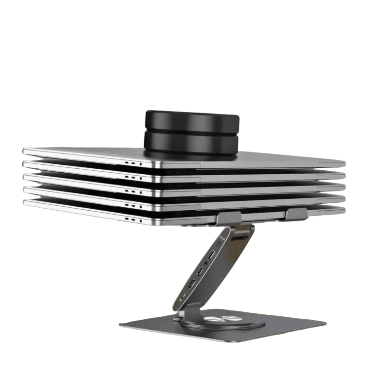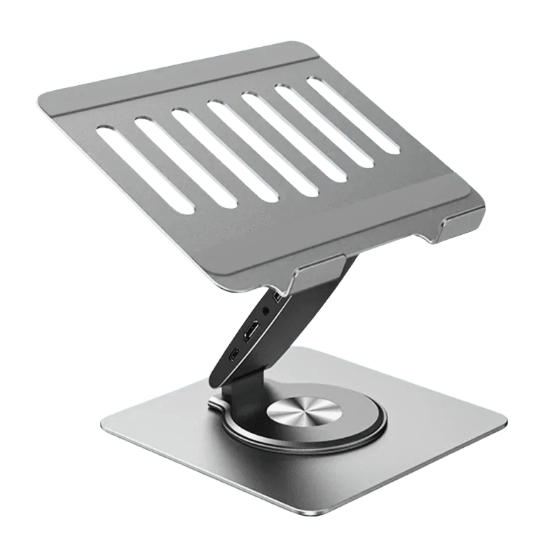 Support PC portable avec ports USB, HDMI et SD. Ergonomique, ventilé et stable, il centralise vos connexions pour un poste de travail moderne et confortable.